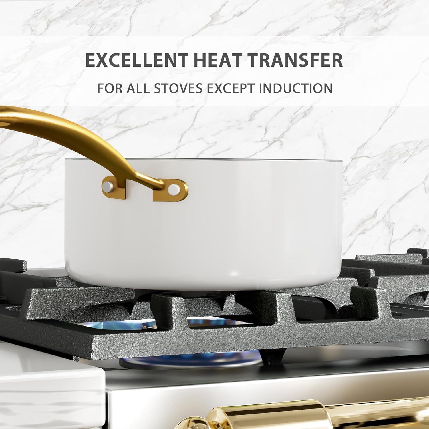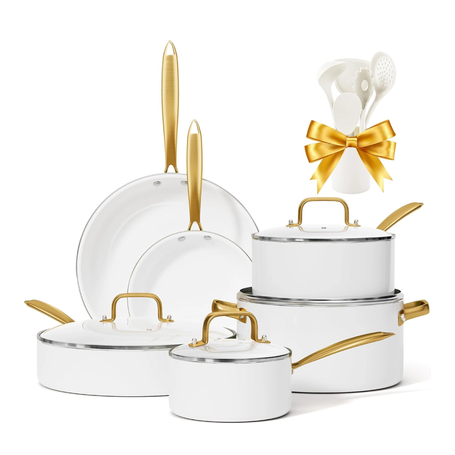 Transform your kitchen with this elegant 16-Piece Ceramic Cookware Set, designed to combine healthy cooking, modern style, and everyday convenience. Crafted with a premium non-toxic ceramic nonstick coating, this cookware set allows you to cook with less oil while ensuring easy food release and effortless cleaning. The set includes a complete range of pots and pans along with matching cooking utensils, making it perfect for sautéing, boiling, frying, and simmering a wide variety of meals. Finished in a sophisticated white and gold design, this cookware set adds a touch of luxury to any kitchen and also makes a thoughtful gift for weddings, housewarmings, or special occasions.