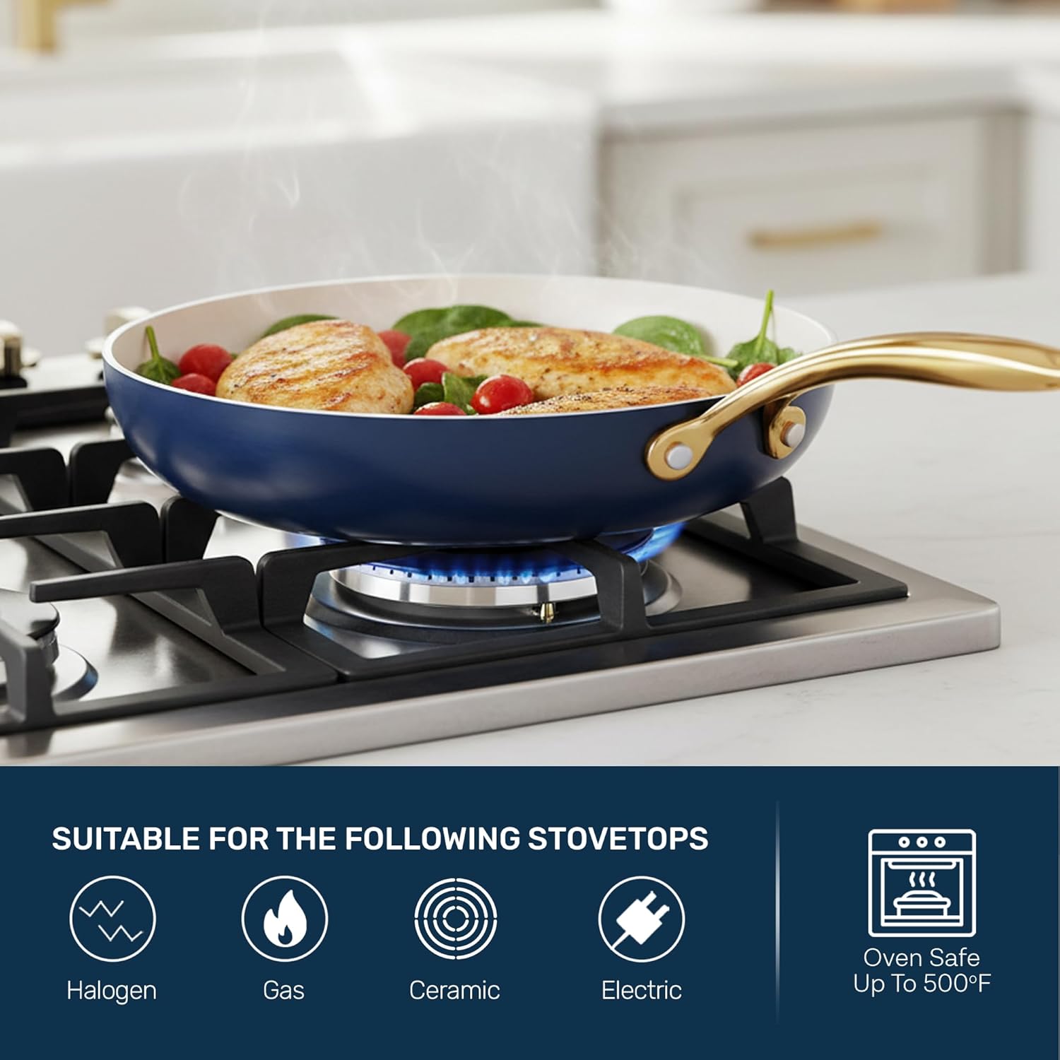 Designed for convenience and comfort, this cookware set comes with ergonomic, heat-resistant handles that provide a secure grip during cooking. Tempered glass lids with steam vents let you monitor food easily while locking in moisture and taste. The set also includes essential cooking utensils, perfectly matched to protect the ceramic coating from scratches and extend the life of your cookware. Compatible with gas, electric, and ceramic cooktops (induction compatibility may vary), this set suits most kitchens. Easy to clean and stain-resistant, it maintains its elegant appearance even after regular use. Ideal for home cooks and families, this ceramic nonstick cookware set combines functionality, safety, and modern style for a complete cooking experience.